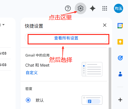 在 Gmail 页面右上角,点击 齿轮图标 → 选择 “查看所有设置”,进入设置界面。